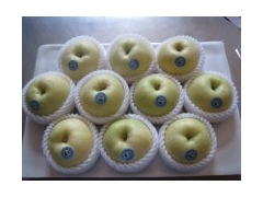 黄金梨:果实近圆形,果形病正,果肩平,果形指数0.9,不套袋果果皮黄绿色,贮藏后变为金黄色;套袋果,果皮黄白,果点小,均匀,外观极其漂亮;果肉乳白色,果核小,可食率95%以上,肉质脆嫩,果波动多而甜,有清香气味,无石细胞。含可溶性固形物12%-15%,平均单果重350克左右,大果500克以上。